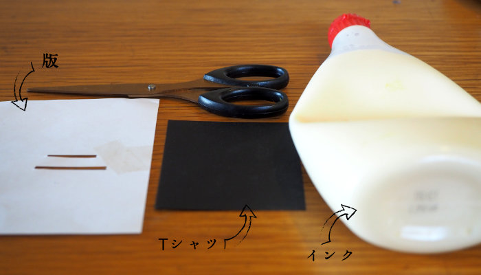 白い紙(版)、黒い紙(Tシャツ)、ハサミ、それにマヨネーズ(インク)を用意して下さい。